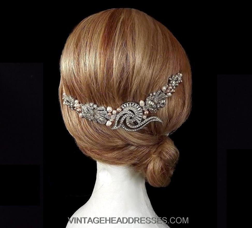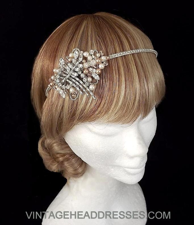 A key wedding trend for 2016 is the soft glow of rose gold. Following on from the popularity of blush bridal dresses and accessories, rose gold metallics are being seen everywhere; from wedding cakes and venue decor, to shoes, bridesmaids, and most of all, accessories. We have created a collection of beautiful vintage rose gold bridal headpieces, all featuring rare vintage pieces, offset with rose gold Swarovski pearls and crystals. Below are a few ideas to provide inspiration to all you lovers of rose gold, along with some designs from our vintage rose gold bridal headpiece collection.